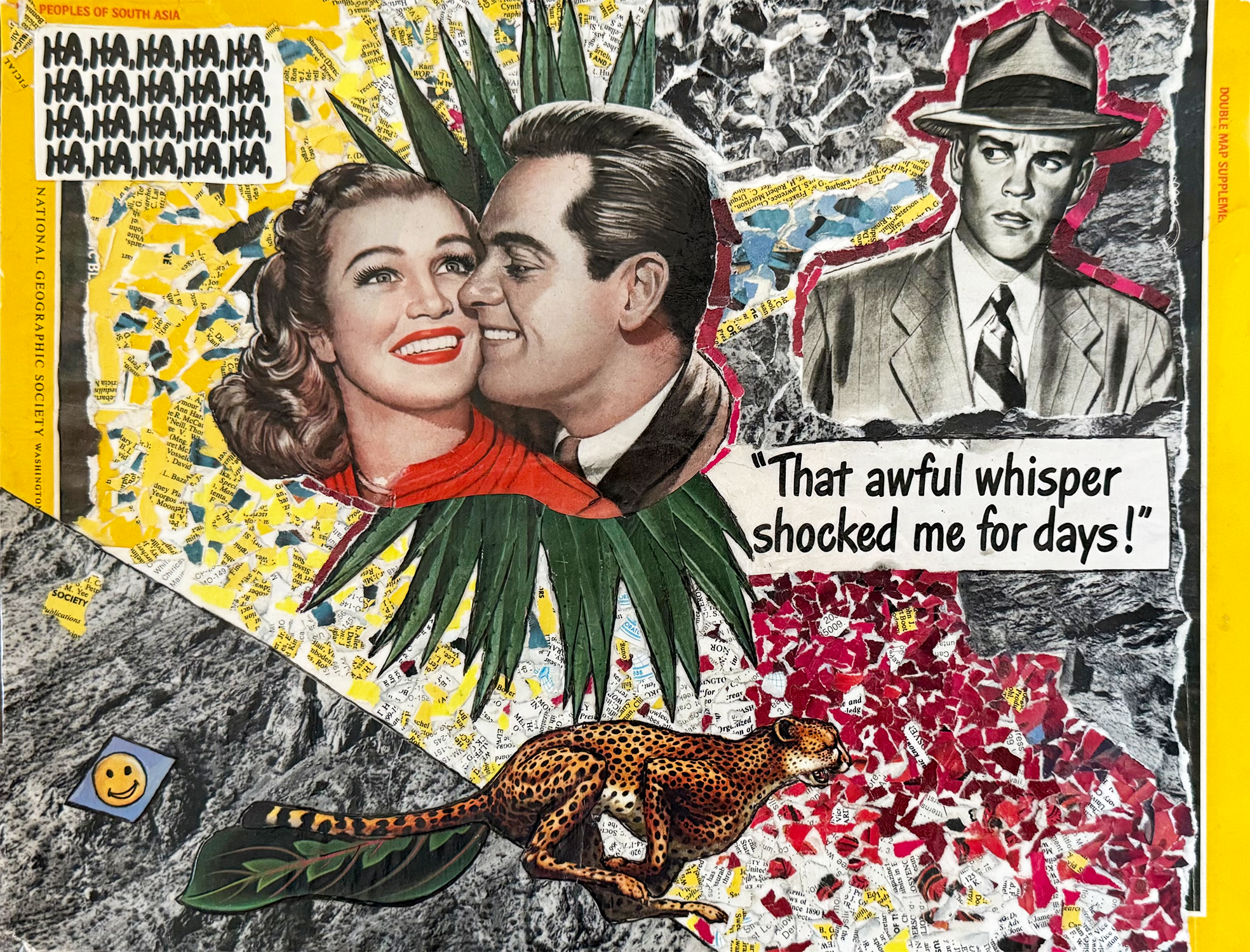 ‘Cheetah’ is a collage exploring the hidden emotions that can arise in romantic relationships. Through the deliberate arrangement of each element, down to the smallest detail, Greenfield invites viewers to engage deeply and discover personal meanings that resonate with their own experiences. The use of torn paper arranged in a mosaic pattern emphasizes the tactile qualities of paper as a medium, reinforcing the connection between material and message in this artwork.